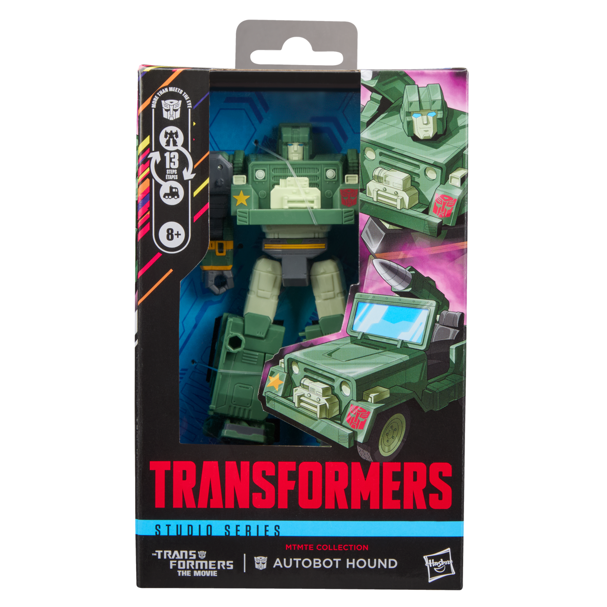Celebrate the 40-year anniversary of The Transformers: The Movie with the Transformers Studio Series MTMTE Collection Autobot Hound action figure. The 5.5-inch (14 cm) figure converts from robot to Army vehicle mode in 13 steps. With movie-inspired details, intricate poseability, and attachable shoulder cannon and blaster accessories, this Autobot Hound figure makes an awesome addition to any collection. Look for more Transformers collectible toys (sold separately, subject to availability) featuring favorite characters like Optimus Prime, Bumblebee, Megatron, and more to create a lineup that is — More Than Meets the Eye